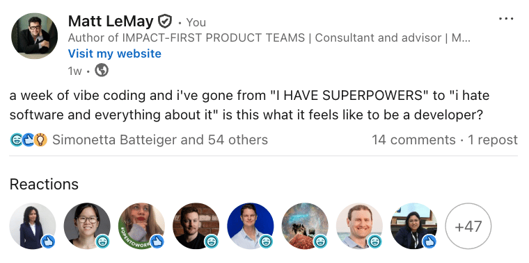 There are some product manager-y takeaways to share here about wHaT mY dEsCeNt iNtO AI BrAin FrY tAugHt me AbOut B2B SaaS but… for now, I just wanted to share this experience in its unpolished state. It feels good to share experiences directly without having my words or thoughts mediated by an engagement-optimization machine. Different-good. Good-good.